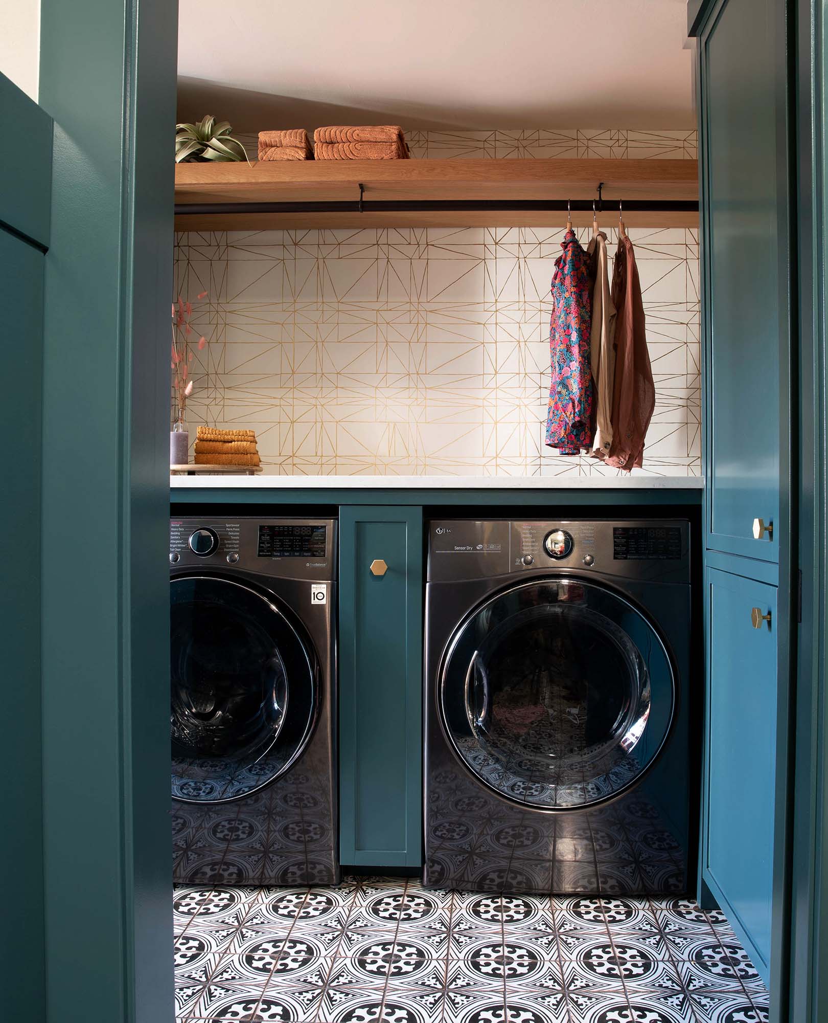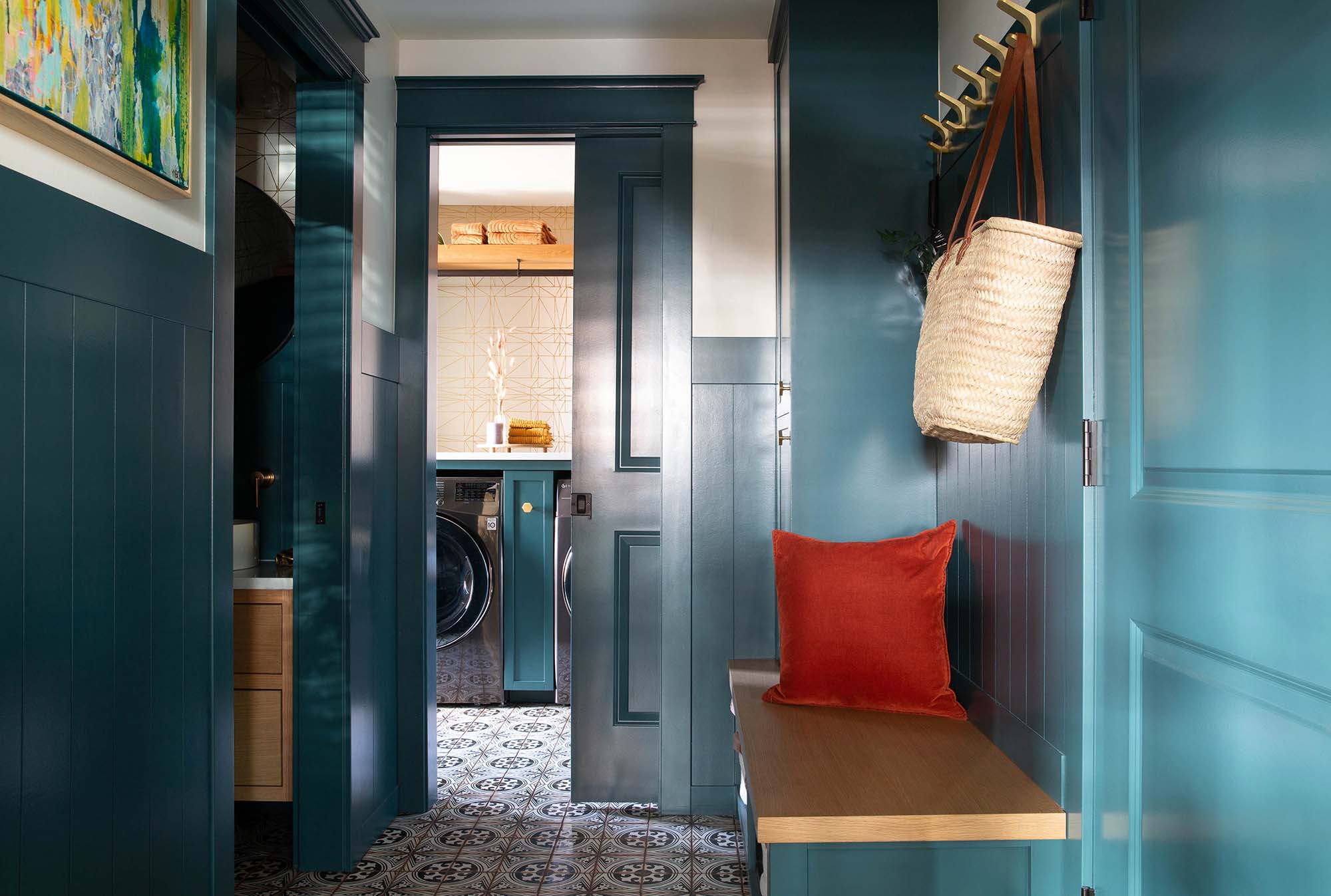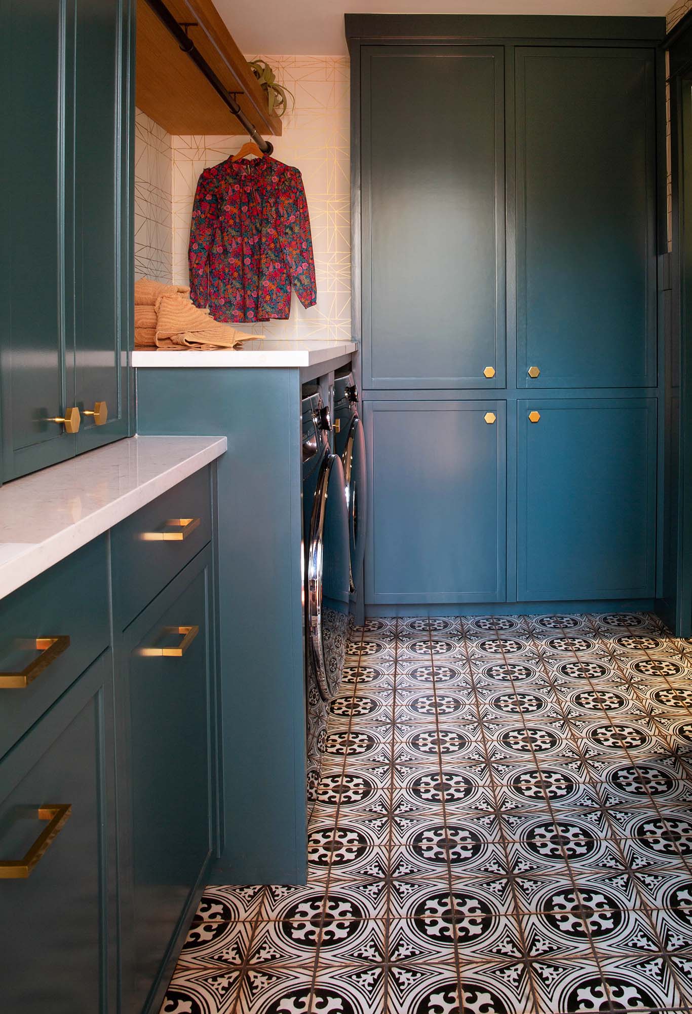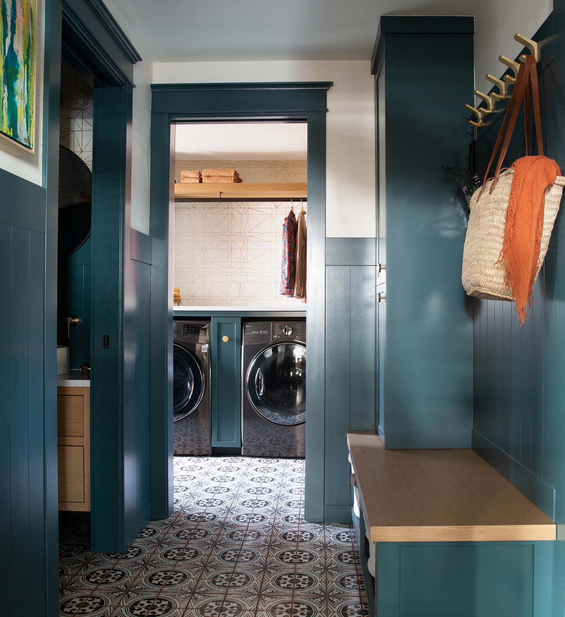 This home’s original utility room, which included a laundry room, mudroom, and a half-bathroom, was tight, dark, and lacked storage. Accessibility was also a key component of the redesign.