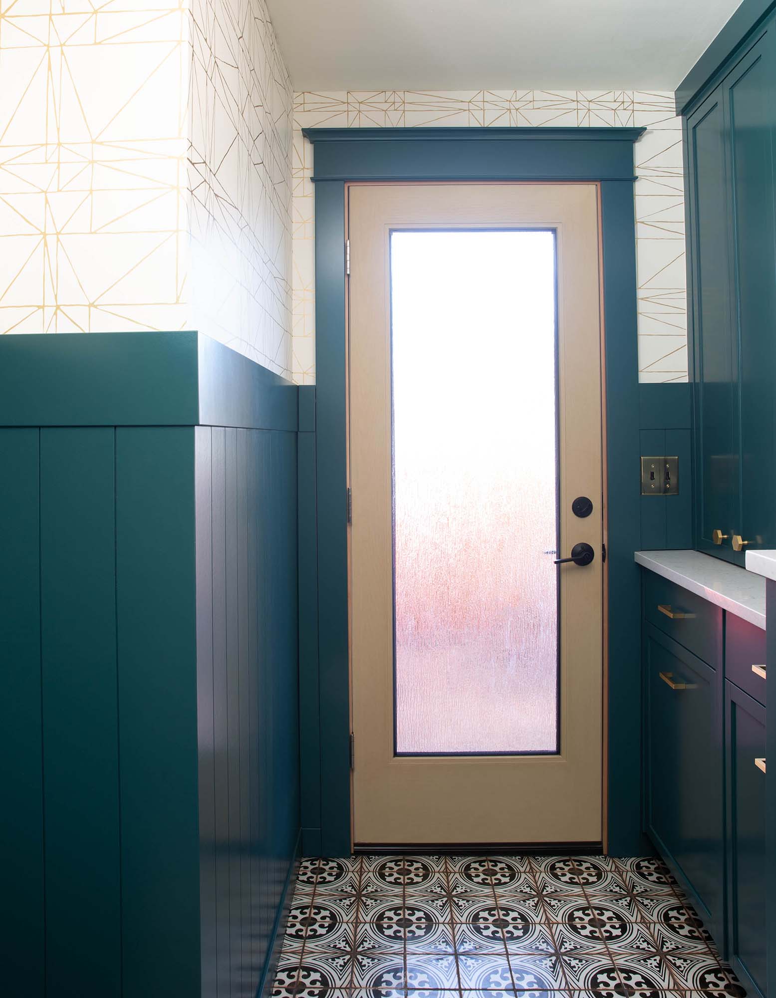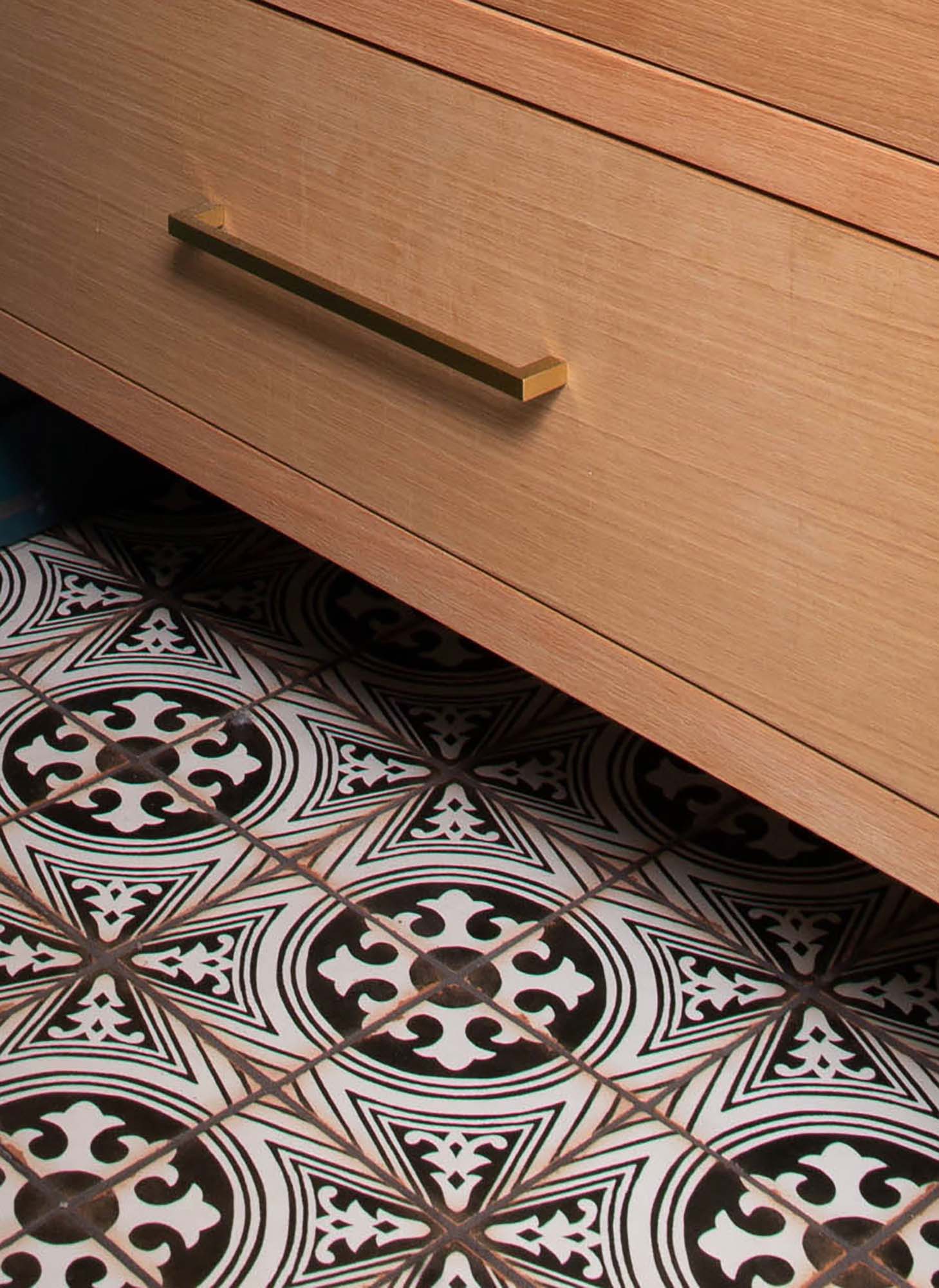 We created a visually cohesive space to meet our client’s lifestyle and design preferences by bringing in a material palette that reflected their personalities while continuing to speak to the house’s architectural details. By using small scale tile we created a grippier surface, using the same flooring through out the space also meant we avoided tripping hazards. The final result is a re-imagined space that blends utility function with inviting beauty.
