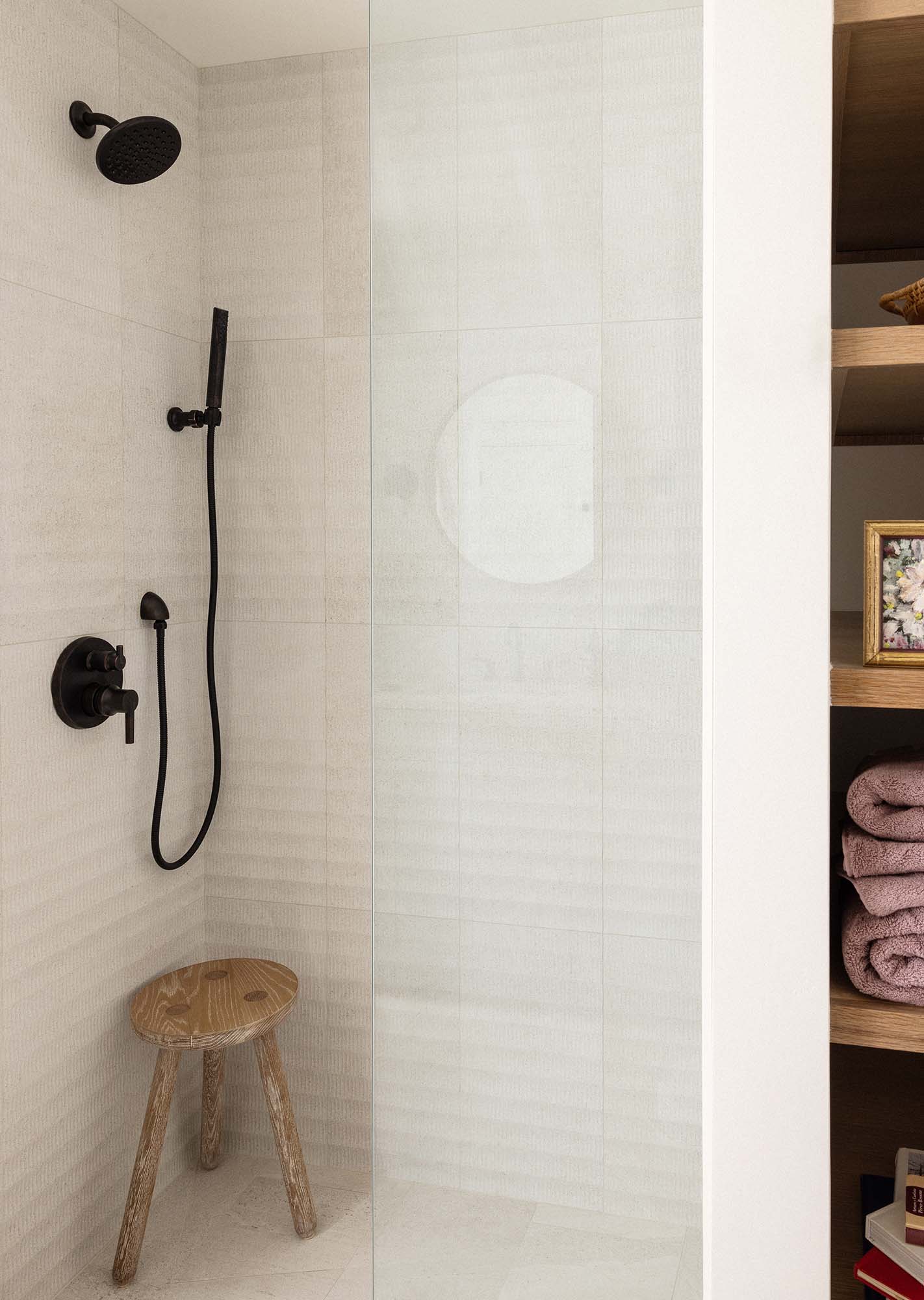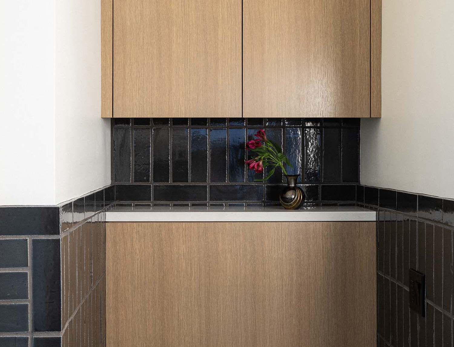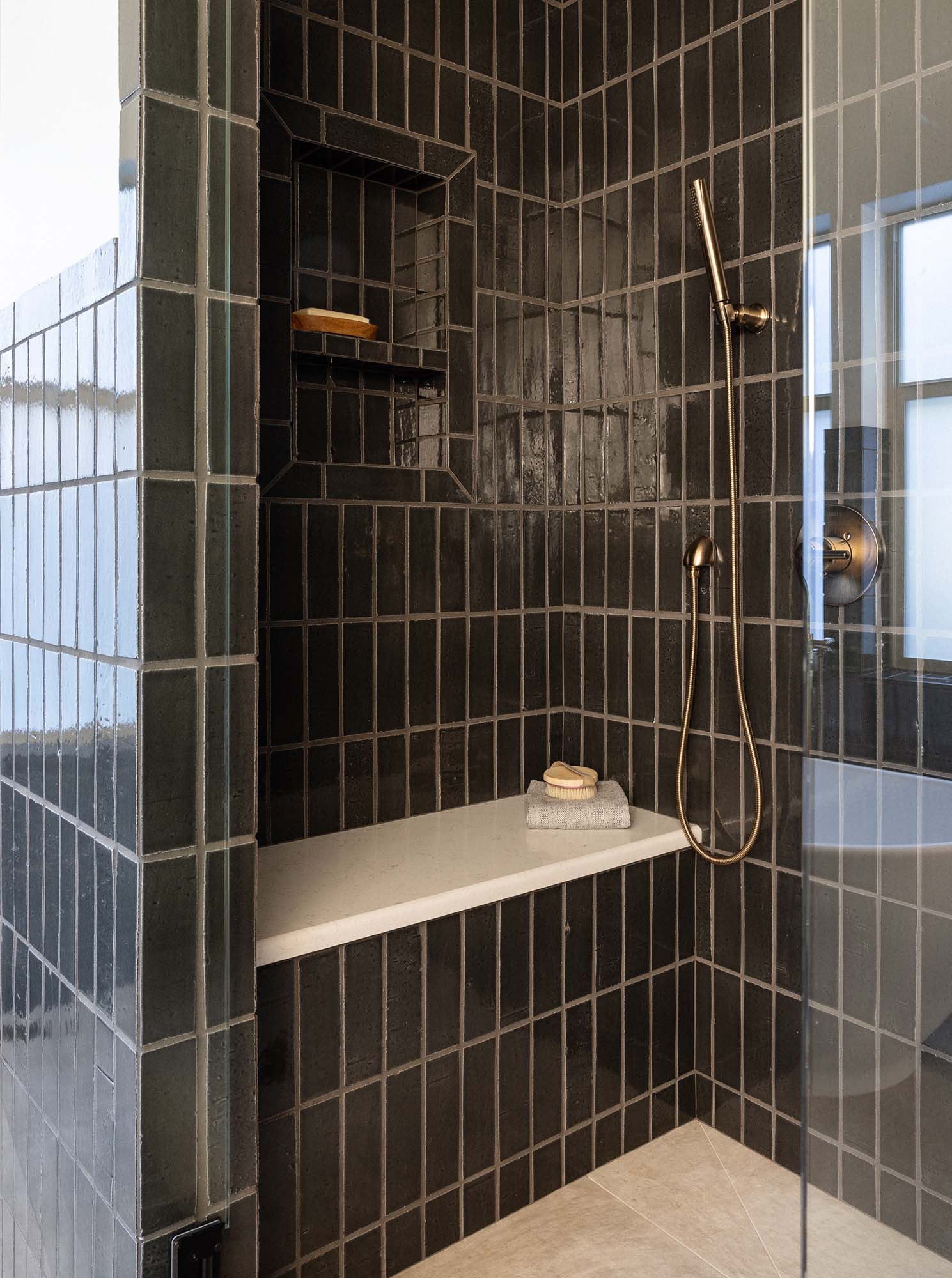 “Step inside a bathroom cloaked in smoky allure. Gorgeous, glossy Glazed Thin Brick adds depth and texture to the walls and shower of this handsome space”