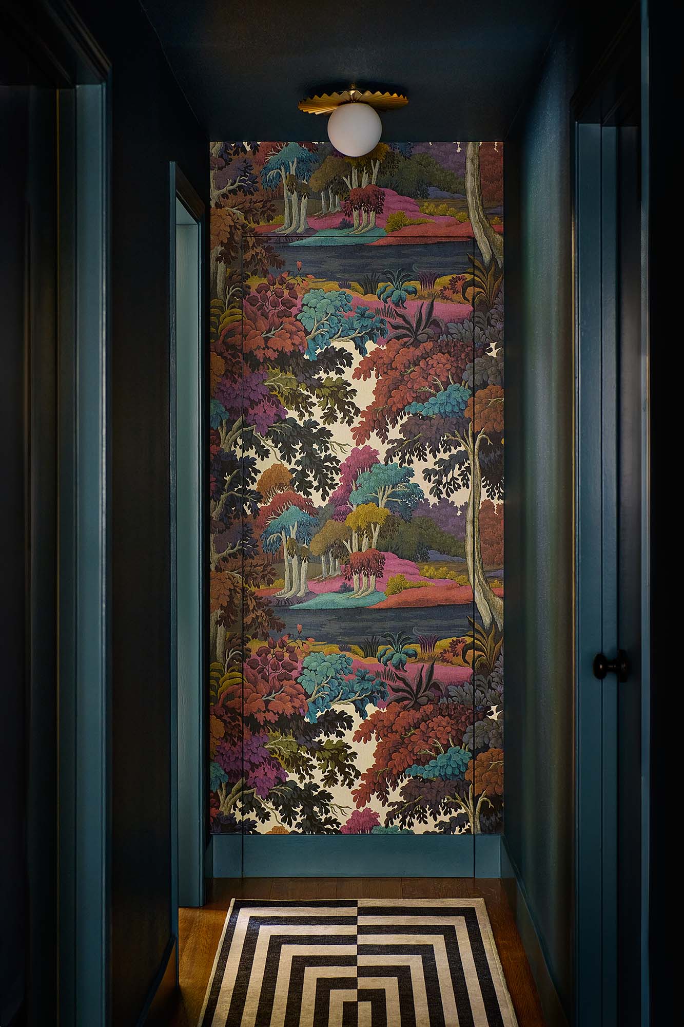 The result is a space that feels comfortable, inviting, and joyful. The addition of a hidden door at the end of the hallway brings an elegant element of jest that reflects our clients’ personalities. Intentional layers of color, texture, and pattern transformed what was once a series of white rooms, some with challenging layouts, into a warm, welcoming home that invites you to listen to your inner needs